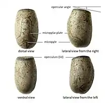 The 4 to 5 millimetres (0.16 to 0.20 in) long and 2 to 3 millimetres (0.079 to 0.118 in) wide eggs are laid in the ground as with all Obrimini by means of the ovipositor at the end of the abdomen. Their eggshell (exochorion) is gray and becomes darker when the humidity is higher and lighter again when it is dry. The dorsal area is bulging and the lid (operculum), which is always dark gray sits on the egg, sloping towards the ventral side, so that an opercular angle of about 10 degrees is created. The nymphs hatch from the eggs after about four months and then need another four months to grow.[4]