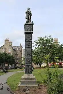 The column was designed by James Gowans as the showpiece for the Brassfounders' Guild of Edinburgh and Leith for the International Exhibition of Industry, Science and Art, a world's fair held in Edinburgh in 1886.[1] The statue at the top of the statue depicts Tubal-cain and was designed by John Stevenson Rhind.[2] At the fair, the column won a gold medal.[3] Following the fair, the monument was moved to Nicolson Square in Edinburgh, where it still stands.[4] In 2008, the square and column underwent slight restoration.[3]