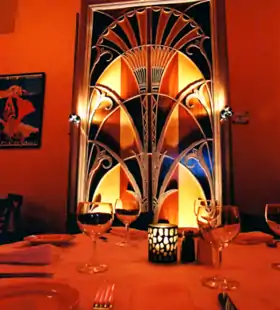The art-deco wooden decor was handmade by Chef Feret, including a replica of the elevator door of New York City's Chrysler Building.[2]