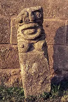 All Saints' Church has a circular churchyard. A sculpted stone stands in the churchyard, at the west end of the church, close to the tower. Known as the Braunston "Goddess", it was found in about 1920 when the church doorstep needed to be replaced; when the slab was lifted, the carving was revealed on the underside. There has been considerable speculation as to its age and meaning, and its original position as part of the church building, or whether it may even predate the church. It is not a gargoyle as it has no drainage channel. It may have had an apotropaic purpose.