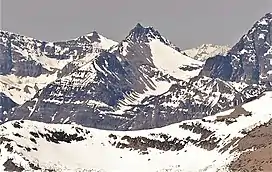 Brave Dog Mountain centered, from Firebrand Pass with Sheep Mountain to left, Peak 8888 to right