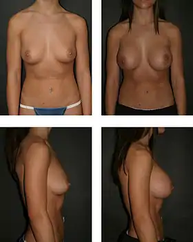 Breast augmentation and augmentation mammoplasty is a cosmetic surgery technique using breast-implants and fat-graft mammoplasty techniques to increase the size, change the shape, and alter the texture of the breasts of a woman. Augmentation mammoplasty is applied to correct congenital defects of the breasts and the chest wall. As an elective cosmetic surgery, primary augmentation changes the aesthetics – of size, shape, and texture – of healthy breasts.