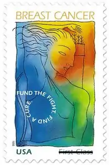 The stamp originally cost 40 cents;[5] a regular first-class stamp cost 34 cents at that time.[6] 70 percent of funds raised are donated to the National Cancer Institute and 30 percent to the Breast Cancer Research Program of the Department of Defense. As of May 2006, US$35.2 million had been donated to the NCI and the Department of Defense had collected US$15.1 million.[7]