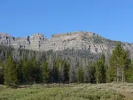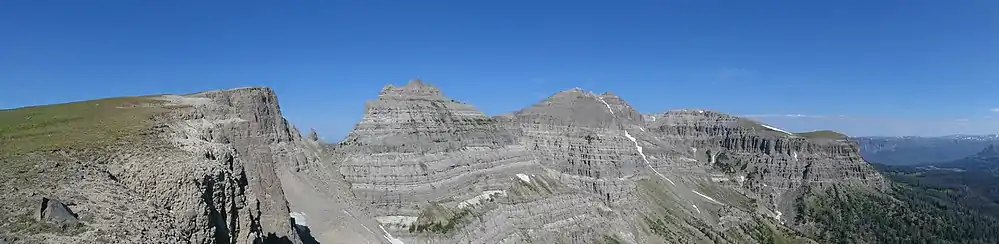 Breccia Peak is located about 2.5 miles (4.0 km) north of Togwotee Pass, part of the Great Continental Divide which connects Jackson Hole from the west to the Wind River valley in the east. The plateau-like summit contains the steep and rocky Breccia Cliffs on its west and north faces, while a mainly grassy face exists to the east and south.[1]