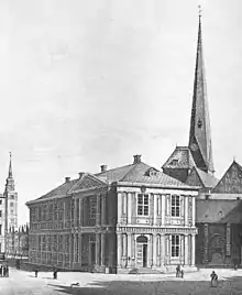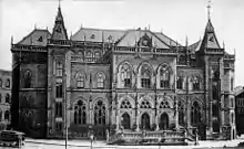 In 1855 the Bremen Chamber of Commerce and the Exchange Organisation agreed on the construction of a new building. For this purpose they had an area on the east side of the Marktplatz cleared between 1860 and 1863, demolishing seventeen old gabled houses and Wilhadi Chapel. A new commercial hub was erected between 1861 and 1864 under the direction of Heinrich Müller and inaugurated on 5 November 1864.