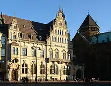 The New Exchange (Neue Börse) on the Marktplatz was a large Neo-gothic building with two towers and a passage to the Schütting (the offices of the Bremen Chamber of Commerce). The interior was decorated by many of the most well-known artists of the time, including the painters Arthur Fitger and P. Janssen and the sculptor Diedrich Samuel Kropp among others. The building included a great hall, several counting rooms, a meeting room, and offices which were also used by the Bürgerschaft of Bremen. In addition there was a restaurant in the basement, which is still in operation.