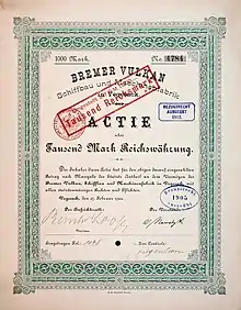 Bremer Vulkan AG was a prominent German shipbuilding company located at the Weser river in Bremen-Vegesack. It was founded in 1893 and closed in 1997 because of financial problems and mismanagement.