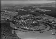 After the 1798 French invasion and under the Helvetic Republic, Bremgarten was granted a town council and became part of the District of Bern. The first bridge over the Aare at Bremgarten was the Neubrügg which was built in 1466. However, the town remained isolated from the major roads leading to Bern until the 20th century.[3] In 1921, the much larger Seftausteg bridge was built next to the Neubrügg. This was followed in 1928 by the Felsenaubrücke which was built by the army as a wooden bridge in 1929 and rebuilt as a solid-web girder bridge made of packed concrete in 1949.[5]