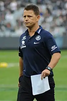 Brendon Bolton (born 18 April 1979) is an Australian rules football coach who is currently serving as the director of coaching with the Collingwood Football Club in the Australian Football League. Bolton previously was the head coach of the Carlton Football Club in the Australian Football League, having served in the role from 2016 to 2019.[3] Prior to serving in this role, he served as the head coach of Victorian Football League club Box Hill from November 2008 to October 2010, guiding the club to two consecutive finals series in his two seasons in charge. Bolton would return to Hawthorn shortly after leaving Carlton