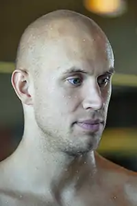 After disappointment at the previous two Olympics when he failed to qualify for the 100 m final, he became the first Canadian to do so in swimming's glamour event since Dick Pound in 1960.[7] He went on to win bronze medal for Canada at the 2012 Summer Olympics in the 100 m freestyle after a strong start placed him in medal contention at the turn.[2] Gold and silver went to American Nathan Adrian and world champion James Magnussen of Australia, while Hayden beat out Yannick Agnel and César Cielo for third; the medals were also presented by Dick Pound. Though only a bronze, the medal was a redemption for Hayden, who was visibly ecstatic at winning an Olympic medal at long last. With his Olympic medal finally in his possession, he said that "There are so many times when you can dream of something but a million out of a million and one times it won't come true. This was one of the things that I was very fortunate as a human being to have happen to me."[8] Hayden announced his retirement from the sport after the 4×100-metre medley relay at the Olympics but said he believed in the Canadian swim team to thrive in the future, saying that "I think in the grand scheme of things, with the people we have, we've done an amazing job … As long as we keep that momentum building, I think we're going to see more success come from more diverse events."[9]