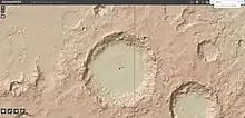Briault is an impact crater in the Mare Tyrrhenum quadrangle of Mars, located at 10.2°S latitude and 270.4°W longitude. It is 96.6 kilometers in diameter and was named after P. Briault, and the name was approved in 1973 by the International Astronomical Union (IAU) Working Group for Planetary System Nomenclature (WGPSN).[1] The dark areas seen in the images are dunes; the curved dunes are called barchans.
