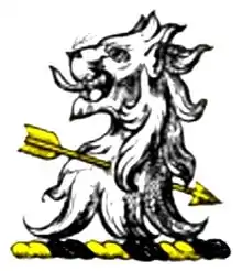 A lions head erased, ermine, pierced with an arrow, or