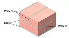 Parts of brickwork include bricks, beds and perpends. The bed is the mortar upon which a brick is laid.[9] A perpend is a vertical joint between any two bricks and is usually—but not always—filled with mortar.[10]