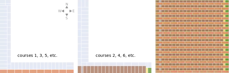 Many other particular adjustments of course alignment exist in monk bond, generating a variety of visual effects which differ in detail, but often having the effect of directing a viewing eye diagonally down the wall.[39]