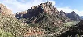 Bridge Mountain is located east of the park headquarters near the south entrance to Zion Canyon. Bridge Mountain was once originally named Crawford Mountain after the Crawford family who were early Mormon settlers in the canyon. But the name was officially changed to Bridge Mountain in 1934 when a natural bridge was discovered on Bridge Mountain. However, it was not a bridge, but actually a natural arch. For years, rangers in Zion Park told visitors that this was a natural bridge, hence the mountain's name.[4] A bridge is defined as a subtype of arch that is primarily water-formed. To avoid confusion, the National Park Service eventually named the span Crawford Arch. Precipitation runoff from the mountain drains into tributaries of the North Fork Virgin River. This mountain is composed of Navajo Sandstone, with a red shale outcropping of the Kayenta Formation exposed along the lower slopes.