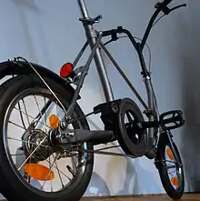 The folding mechanism is extremely simple, which accounts for the fact that the Picnica was marketed as the "One-touch Picnica" (Japanese: ワンタッチピクニカ). In a review, the Picnica folding mechanism was described as a "case of the frame collapsing backwards on itself, with the handlebars and seat post falling to the top of the rear wheel. To this end, the main part of the frame is a quadrilateral with a pivot at each corner, and a rear triangle made collapsible by hinged seat stays. It's those seat stays that hold everything in place. In the riding position they're straight and rigid, as on any bike. The upper part of each seat stay is locked in a retaining channel by spring pressure; squeeze the upper seat stays inwards and they pop out of their channels, and the hinge 'unlocks'. The upper and lower seat stays then fold over as the main frame folds – the whole bike collapses under its own weight."[4]