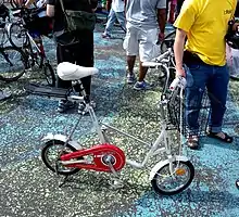 The Bridgestone Picnica (Japanese: Burijisuton Pikunika: ブリヂストン 「ピクニカ」) line of collapsible bikes, some models featuring belt-drives, were introduced in the early 1980s and carried in the Bridgestone Cycle USA catalogs from 1985 through 1990.[1][2] It weighs 29 pounds, and belt-drive models use a tooth-belt drive like auto timing belts and Harley-Davidson drive belts, along with a novel two-part chainring that increases belt tension with increasing load. In April 1987, Popular Mechanics described Bridgestone's Beltrex system as follows: "Unlike the belt-drive motorcycles, which can slide the rear wheel back to keep the belt taut, the Beltrex uses a floating pulley that's cogged to the drive gear. Tension on the pedal cranks drives the floating pulley forward, taking up belt slack and preventing tooth slippage."[3]