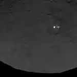 The brightest cluster of spots ("Spot 5") is located in an 80-kilometer (50 mi) crater called Occator.[1][2] The largest and brightest component of the cluster is in the center of the crater, with dimmer spots located towards this crater's eastern rim. Early in the orbital phase of the Dawn mission, the high albedo of these spots was speculated to be due to some kind of outgassing,[3] and subsequent closer images helped scientists determine that it is a material with a high level of reflection, and suggested ice and salt as possibilities.[4] These bright features have an albedo of about 40%, four times brighter than the average of Ceres's surface.[5]
