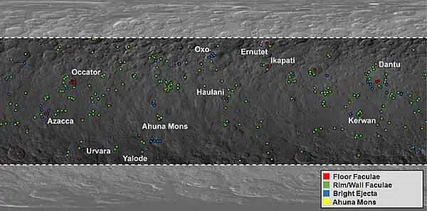 The spot in the center of the crater is named Cerealia Facula,[16] and the group of spots to the east - Vinalia Faculae.[17] These names were approved by International Astronomical Union 26 November 2016.