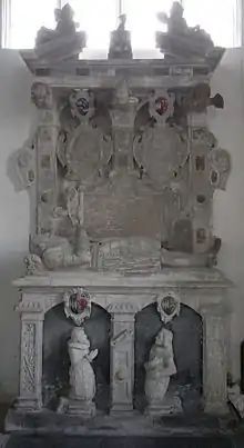 This monument situated against the north wall of the north transept serves as a memorial to five generations of the Giffard family of Brightley, the principal manor within the parish of Chittlehampton. It was erected in 1625 by John Giffard (1602–1665), then a young man, shown kneeling at the bottom right, ostensibly as a monument to his grandfather John Giffard (died 1622), whose heir he was and who is represented by the main recumbent effigy. The young John's father Arthur Giffard (died 1616), who died during his own father's lifetime and thus never inherited Brightley, is shown kneeling opposite his son at the bottom left, praying before a book placed on a prie dieu. Two renaissance-style stone medallions showing faces in profile sculpted in relief are positioned above the recumbent effigy and, as is indicated by the heraldry, represent on the left Sir Roger Giffard (died 1547) who married Margaret Cobleigh, heiress of Brightley, and on the right his son John Giffard (1524-1623), who by his wife Mary Grenville, was the father of John Giffard (died 1622), the recumbent effigy below him.[24] On a panel directly above the recumbent effigy is an inscription in Latin, translated into English thus:
