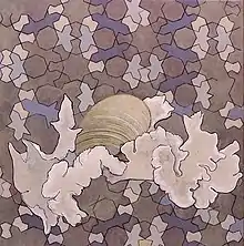 This series of paintings (2001) deals with plants and the light that they absorb to make them grow. Graphite and silver leaf are the media used in this series. The reflective qualities of these materials represent the light that is trapped by plants. Malche increasingly focuses on nature and its structures. She presents motifs from various areas of zoology and botany together in a collage-like style. For example, snail shells or sea shells may be interwoven with their molecular structure, or she might develop a crystal’s structure layer by layer. The artist combines patterns from the micro- and macrocosm, abstraction and figuration, movement and geometric patterns.