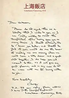 In Limehouse, Chang opened the Shanghai Restaurant. He lived at 13 Limehouse Causeway[18] on the middle floor of a three-story house, with just a kitchen and bedroom at his disposal. The bedroom was decorated luxuriously with a blue and silver design featuring dragons.[19] Chang's customers were far more conspicuous in Limehouse, however, than they had been in the West End and a police detective noted the stream of glamorous young ladies who visited him. Chang's home was raided twice, and on one of those occasions, the police found two chorus girls in his bed.[8][19]