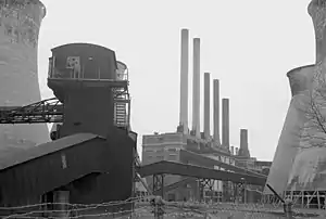 ![]() Brimsdown Power Station 1974, showing part of the coal handling plant and 4 of the 7 cooling towers | |
