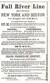 When first put into service, the owner of the Narragansett Steamship Company, Jim Fisk, would don an elaborate Admiral's uniform and greet every passenger boarding Bristol (or her sister ship Providence) at the gangway. Right on schedule, Fisk would give the order to sail, and the ship would put to sea "with the heavy load of passengers crowding her decks, music playing, flags flying, all her crew in uniform, each man having a badge on his cap showing his office and duty...". Fisk would remain on board until the ship pulled well out into the bay, at which time the vessel would stop and he would transfer to a pilot boat which would take him back to the city, after which Bristol would continue on her way.[10][12]