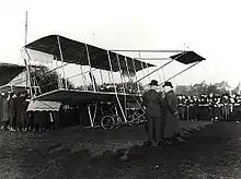 On 14 March 1911, the British War Office ordered four Boxkites for the planned Air Battalion Royal Engineers,[lower-alpha 1] the first production contract for military aircraft for Britain's armed forces. The first Boxkite, powered by a 50 hp Gnome engine, was delivered to Larkhill on 18 May that year. An order for a further four Boxkites was placed later that year, with the type mainly being used as a trainer.[15] They continued in use with the Air Battalion and Royal Flying Corps (RFC) until December 1912.[16] Four more Boxkites were purchased by the RFC from the Bristol flying school at Brooklands following the outbreak of the First World War, with the last of these four Boxkites written off in February 1915.[17] The Royal Naval Air Service (RNAS) also made use of the Boxkite as a trainer, being used at its training schools at Eastbourne, Eastchurch and Hendon Aerodrome until at least 1915.[18]