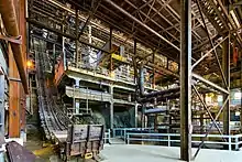 The mill received ore at its peak, 230 feet (70 m) from its base, where it entered the concentrator.[8] It passed down stages of the concentrator by gravity,[9] through eight levels of the structure.[8] From the bottom level, it was piped directly into the hold of a cargo ship.[9]