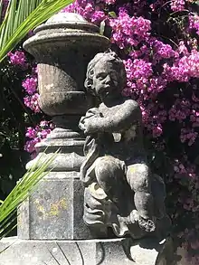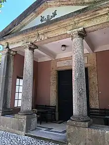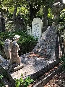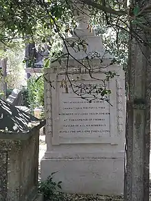 At the time it was established, the Cemetery was well outside the built-up area of the city, being surrounded by farms and vineyards. A wall was built around it, with an entrance to the west. Trees, mainly cypress, were planted, as the Inquisition wanted to "hide the graves of the heretics from the eyes of the faithful", and the plot became known as the "Cemetery of the Cypresses". The path from the entrance to St George's Church to the northwest of the plot was also bordered by cypresses. Many were blown down by a cyclone in 1941 but some of the original trees remain. Although now surrounded by roads and buildings, the Cemetery remains well wooded, but insufficiently wooded for residents of surrounding apartments who reportedly complained about the view in 2022.[5] The original British lease document was lost in the 1755 Lisbon earthquake but the first Dutch lease survives. The Cemetery, itself, was largely undamaged by the earthquake, although there is evidence of the ground levels being raised in places. According to available records, 68 British people were killed by the quake, although there is no reference to the event in Church records or on any tombstones.[1][4][6]