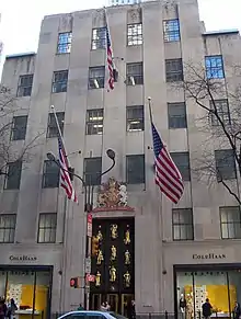 The entire facade is made of limestone. The ground floor of the British Empire Building includes storefronts and display windows on all four elevations.[18] The building's storefronts were originally assigned address numbers 620A to 620G on Fifth Avenue.[22] The British Empire Building contains a cornerstone at its southeast corner, with inscriptions.[23] Above the ground floor is a cornice with a bead and reel molding. The second through seventh floors have steel sash windows with slightly recessed limestone spandrels between the windows on each story. The windows are separated by flat vertical piers with ribbon moldings at their capitals.[18][24] Three flagpoles hang from the piers on Fifth Avenue. The setbacks are also topped by ribbon moldings.[18] There are also cornices above the setbacks, which were intended to draw viewers' attention toward 30 Rockefeller Plaza.[21]
