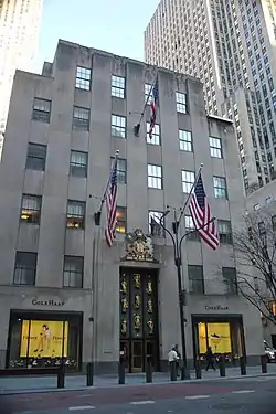 As American tenants were reluctant to rent in these retail buildings, Rockefeller Center's manager Hugh Robertson, formerly of Todd, Robertson and Todd, suggested foreign tenants for the buildings.[84][85] Rockefeller Center's managers held talks with prospective Czech, German, Italian, and Swedish lessees who could potentially occupy the six-story internationally themed buildings on Fifth Avenue. Dutch, Chinese, Japanese, and Russian tenants were also reportedly considered.[79][84][85] The British government leased the building in January 1932,[86] making it the first themed building for which an agreement was made.[29][87][77] The building was to be a free port, with all of its merchandise being exempted from tariffs,[88] and it would host the governmental and commercial ventures of the United Kingdom.[77][87] The seventh-story penthouse above the building was added late in the design process.[19]