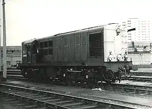The design also shared some similarities with the contemporary British Rail Class 15; both locomotives adopted the road-switcher layout that had been rapidly becoming the standard approach on the railways of both North America and Australia at the time; they were also both powered by an 800 hp (600 kW) Paxman 16YHXL prime mover.[2][3] However, the North British design suffered a major setback as a result of external policy decisions; while the company had decided to approach the new era of diesel traction by specialising in hydraulic transmissions in partnership with the West German industrial interest Voith, BR planners had decided to favour electric transmissions instead, putting the firm at a competitive disadvantage to those locomotive builders that had opted for this transmission system.[3]