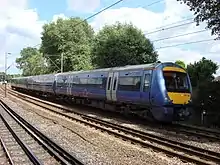 Class 357 units were built with 100 mph (161 km/h) capability, although the maximum line speed on the London, Tilbury and Southend line (the Essex Thameside franchise) is at present only 75 mph (121 km/h). They all have air conditioning, air suspension, CCTV,[7] standard class 3+2 Chapman seating throughout, 28 computers,[8] sliding plug doors, and rheostatic and air disc brakes, and now have regenerative capacity.[9] As with all Electrostar units, they use insulated-gate bipolar transistor (IGBT) AC motor drives. They have Tightlock fully automatic couplers but are only interoperable within their own class with other Class 357 units.[1] There are orange LED dot matrix displays at the front of each unit which show the time due at the destination and the name of the destination, e.g. "17.10 Grays", or "Not in Service" or "Empty to Depot" as necessary. The time due at the destination updates to the new time due if the train is delayed. There are also LED displays inside, at the end of each carriage above the gangway which give route and customer service information.