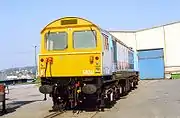 The British Rail Class 58 is a class of Co-Co diesel locomotive designed for heavy freight. The narrow body with cabs at either end led to them being given the nickname "Bone" by rail enthusiasts.[1]