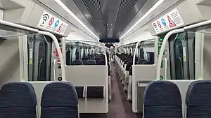 The interior of Class 720 features a 3+2 seating arrangement, these seats are intentionally cantilevered above the floor to provide greater under-seat space for storing personal luggage as well as to ease cleaning.[8] Furthermore, various amenities are present for the convenience and comfort of the travelling public; each car benefits from air conditioning throughout, while numerous passenger information systems, displaying passenger-loading indicators amongst other information, are present across each carriage's interior.[5] Every seat is provided with its own seat-back table and power sockets, while on-train WiFi enables online connectivity throughout the journey. Onboard toilet facilities are also present.[5] Akin to trains operated by the London Overground, the Class 720s have through gangways to encourage passengers to spread out across the train.[5] The interior is also fully compliant with the Technical Specification for Interoperability for Persons of Reduced Mobility, featuring dedicated spaces for wheelchairs, as well as spaces for bicycles; one of the two toilets present in a five-car formation is also outfitted for greater accessibility.[4]