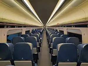While sharing a bodyshell with the previous UK A-train variants, the Class 803 differs in that it has no diesel engines fitted. They are fitted with batteries to enable the train's on-board services to be maintained, in case the primary electrical supplies have failed.[8] Other changes include seating being standard class only, and the lack of a galley area, although catering services are provided through the use of a trolley service. The units also feature air conditioning, power sockets and free Wi-Fi.[9]