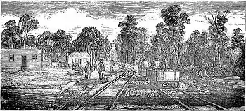 The company hired William Leonard as its manager during September 1872.[16] A settlement nearby to the mine was named Leonardsborough in his honour. Mining operations commenced at Mt Vulcan during 1872, and the new mine was one of the first to use dynamite.[17] By December 1872, a 310-foot long wharf had been constructed, 4¾ miles of timber-railed tramway had been laid, buildings erected at West Arm ('Port Lempriere') and Anderson's Creek ('Leonardsborough'), machinery was on order, 50,000 bricks were ready for the kiln, and construction had started on a smelting furnace.[16]