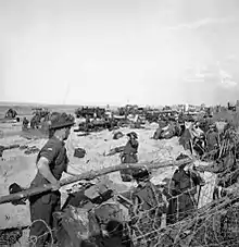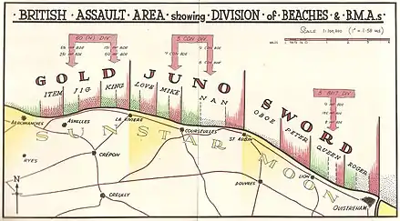 A Headquarters (HQ) Line of Communications was formed from that of the disbanded 54th (East Anglian) Infantry Division. Most of its component areas and sub areas were formed for the campaign.[18] This was commanded by Major-General Frank Naylor, formerly the Vice QMG at the War Office.[19] In the assault, 101 and 102 Beach Sub Areas would support I Corps while 104 Beach Sub Area supported XXX Corps.[20] Each beach sub area controlled two beach groups.[20] These were tri-service formations with units from the Royal Engineers, RAMC, REME, RAOC, RASC, Pioneer Corps and Military Police. The Royal Navy provided each with a Royal Navy Beach Commando and a signal unit; the RAF provided beach anti-aircraft defence. Each beach group also had an infantry battalion to mop up any opposition and then to act as a labour force. A beach group had a complement of about 3,000 men.[21] The beach sub areas would come under 11 Line of Communications Area when Second Army HQ arrived in Normandy and it in turn came under HQ Line of Communications when the 21st Army Group HQ arrived.[22]