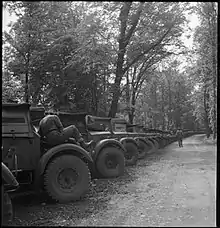 Another expedient was to issue 30 additional lorries to four general transport companies that had enough relief drivers to man them. Two 10-ton companies were equipped with surplus 5-ton trailers. There were also eight DUKW companies, one of which was on loan to the US Army, and was involved in working Utah Beach. Two other companies were retained as DUKW companies and the remaining five were re-equipped with regular 3-ton lorries. In addition to the DUKW company, a 6-ton and a 3-ton general transport company were loaned to the US Army. These two companies were returned to the 21st Army Group on 4 September.[82][84] During the advance from the Seine, the Second Army employed only six of its eight infantry divisions, so the transport of two could be used to help maintain the other six.[85]