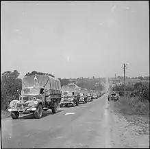 Additional general transport companies were shipped urgently from the UK and some new companies were formed in Normandy, increasing the number of companies for the British Second Army from six to thirty-nine.[79] The War Office agreed to loan another 12 general transport companies to the 21st Army Group but only five had arrived by 26 September.[80] These were formed from Anti-Aircraft Command and Mixed Transport Command.[81] A new headquarters called TRANCO was created on 10 September and all road and railway transport was withdrawn from the armies and assigned to it, with the mission of moving supplies from the RMA to the army roadheads.[75]