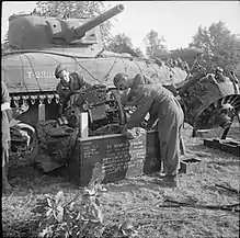 Seven British field artillery regiments were equipped with M7 Priest self-propelled guns, which required scarce American 105 mm ammunition and replaced them with Sexton 25-pounder self-propelled guns, delivered from Britain by 15 Advanced Ordnance Depot.[63] For Operation Totalize, the Canadians converted the surplus Priests into armoured personnel carriers, known as Kangaroos, by removing the guns and welding over the front apertures. The conversion was carried out by Canadian and REME workshops.[64]