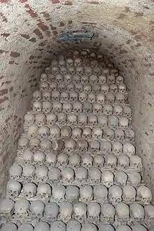 Brno Ossuary is an underground ossuary in Brno, Czech Republic. It was rediscovered in 2001 in the historical centre of the city, partially under the Church of St. James.[1] It is estimated that the ossuary holds the remains of over 50 thousand people which makes it the second-largest ossuary in Europe,[1][2] after the Catacombs of Paris. The ossuary was founded in the 17th century, and was expanded in the 18th century.[3] It's been opened to public since June 2012.[2]