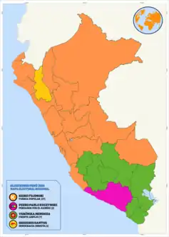 In the congressional snap elections of 2020 the party presented candidates in 25 of the 26 electoral districts of the country. The party obtained the plurality of votes in the department of Amazonas with 20.52% of the votes[33] and in the department of Apurímac with 18.16% of the votes.[34]