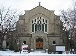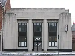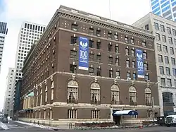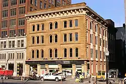 Broad Street has been one of Columbus's two main corridors since its founding, along with High Street, meeting at a 100 percent corner downtown.[2] The street has its origin before High Street and Columbus, with the 1797 founding of Franklinton. The first section of the road was constructed then, on the west bank of the Scioto River. Franklinton, then an independent settlement, had applied to be Ohio's capital. The settlement's founders were persuasive, though its flood problem led Ohio officials to choose the eastern bank of the river, on higher ground. Several streets were then laid out from the city's founding in 1812 into the following year, including Broad and High.[3] These streets and the entire grid were laid out 12 degrees off from a north-south and east-west alignment.[4] Broad Street's construction involved clearing dense forest, and tree stumps left behind caused horse-drawn carriages to maneuver around them, helping lead to the wide roadway.[3]