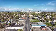 Broad Street and High Street both traverse beyond the extent of the city; High Street is the longest in Columbus, running 13.5 mi (21.7 km) (23.4 across the county), while Broad Street is longer across the county, at 25.1 mi (40.4 km).[2] The city's street plan follows a grid pattern with the intersection of Broad and High Streets at its center.[7] The address system begins its numbering at the intersection of Broad and High, with numbers increasing in magnitude with distance from Broad or High, as well as cardinal directions used alongside street names.[8]