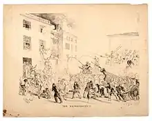 The Broad Street Riot was a massive brawl that occurred in Boston, Massachusetts, on June 11, 1837, between Irish Americans and Yankee firefighters. An estimated 800 people were involved in the actual fighting, with at least 10,000 spectators egging them on. Nearby homes were sacked and vandalized, and the occupants beaten. Many on both sides were seriously injured, but no immediate deaths resulted from the violence. After raging for hours, the riot was quelled when Mayor Samuel Eliot called in the state militia.
