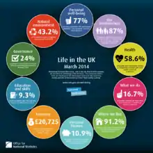 The Life in the UK report was first published in November 2012 and included the National Well-being Wheel of measures, which is being updated twice a year, with the May 2014 update being the latest. The wheel includes headline indicators in areas such as health, relationships, job satisfaction, economic security, education, environmental conditions and measures of 'personal well-being' (individuals' assessment of their own well-being).