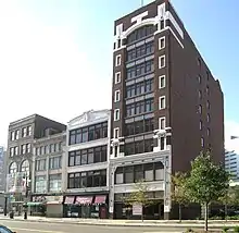 The area where the district is located was developed in the late 1800s as a commercial area catering to the women's trade, and included businesses such as hairdressers, florists, corset makers, and fashionable clothiers.[2] A number of these women's trade shops were owned by ethnic immigrants. During the 1910s, the area began transforming into a banking and financial center. In the adjoining Randolph Street Commercial Buildings Historic District, the building at 1244 Randolph St. is a rare survivor from the 1840s.[3] The Breitmeyer-Tobin Building on Broadway Avenue, now called Harmonie Centre, opened to African-American tenants in 1936. In the 1950s, ethnic and immigrant-owned shops moved into the area, with some of them still in the districts to the present day. The east necklace of downtown links Grand Circus and the stadium area to Greektown along Broadway. The east necklace contains a sub-district sometimes called the Harmonie Park District in the Broadway Avenue Historic District which has taken on the legacy of Detroit's music from the 1930s through the 1950s and into the present.[4]
